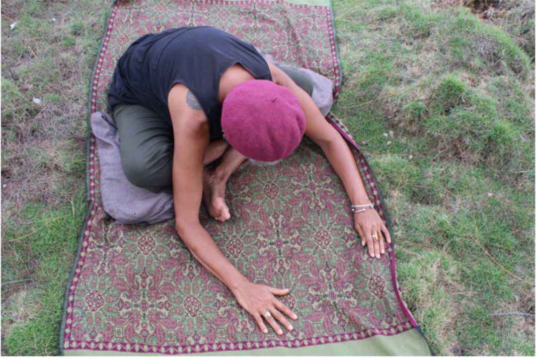 This shape is an opportunity to bow, settle and humble for a moment to assess the truth. Add a cushion under your hips to support the tilting of your pelvis. Think of props as compassionate objects that can meet you where you need to be met. If your knees need support or you know your legs are tight, add a pillow. Your feet may be close to one another or far away, depending on what your body needs for the day. Forward fold as you bow your head. Let your spine, legs and belly dictate where you stop. Social change and true yin is directed by sensation, feeling and inner knowing that is supported by an intentions cultivated over time and space. One develops their own compass as one begins to better understand themselves. It can be the relationship with emotional flexibility that helps to guide our reactions. Spend 2-6 minutes here as you breath deeply, embrace the feeling of resistance. Great change occurs when loving and subtle pressure is held. It can bring about systems change as a reflection from your inner knowings and resources.